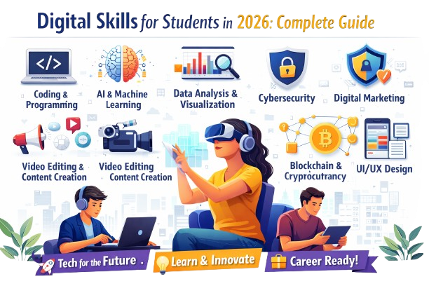 Digital skills for students in 2026 refer to the practical abilities required to use technology effectively for learning, communication, career growth, and problem-solving. These include digital literacy, coding, data analysis, AI awareness, cybersecurity basics, and digital marketing—combined with soft skills like collaboration and adaptability.